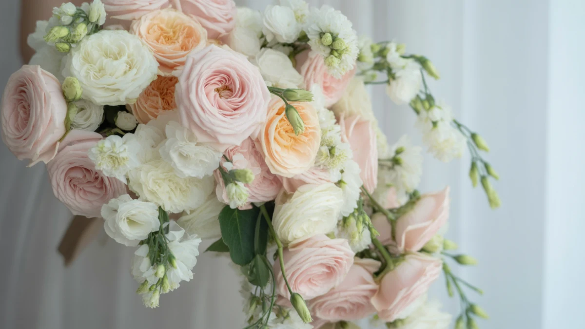 При создании каскадного букета важно учитывать цветовую гамму свадебного платья, время года и личный стиль невесты. В 2024 году предпочтение отдается нежным пастельным оттенкам с вкраплениями более насыщенных тонов.