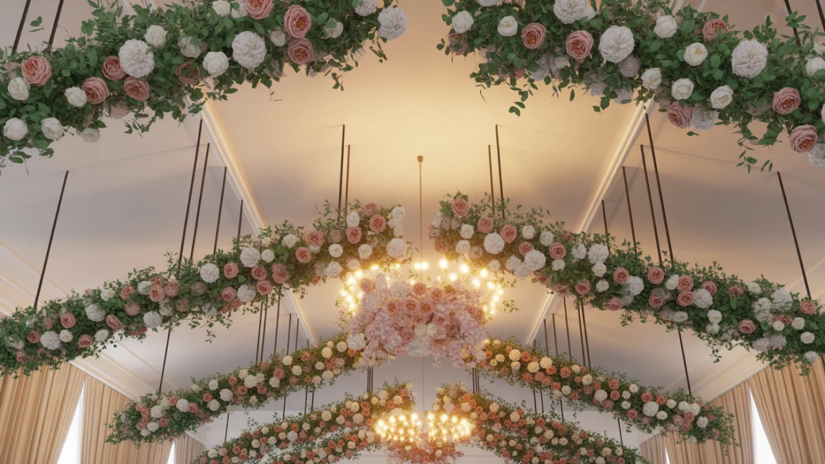 Для потолочного декора из живых цветов лучше выбирать стойкие сорта: розы, хризантемы, гвоздики, альстромерии. Избегайте нежных цветов типа пионов или ранункулюсов — они быстро увянут без воды.